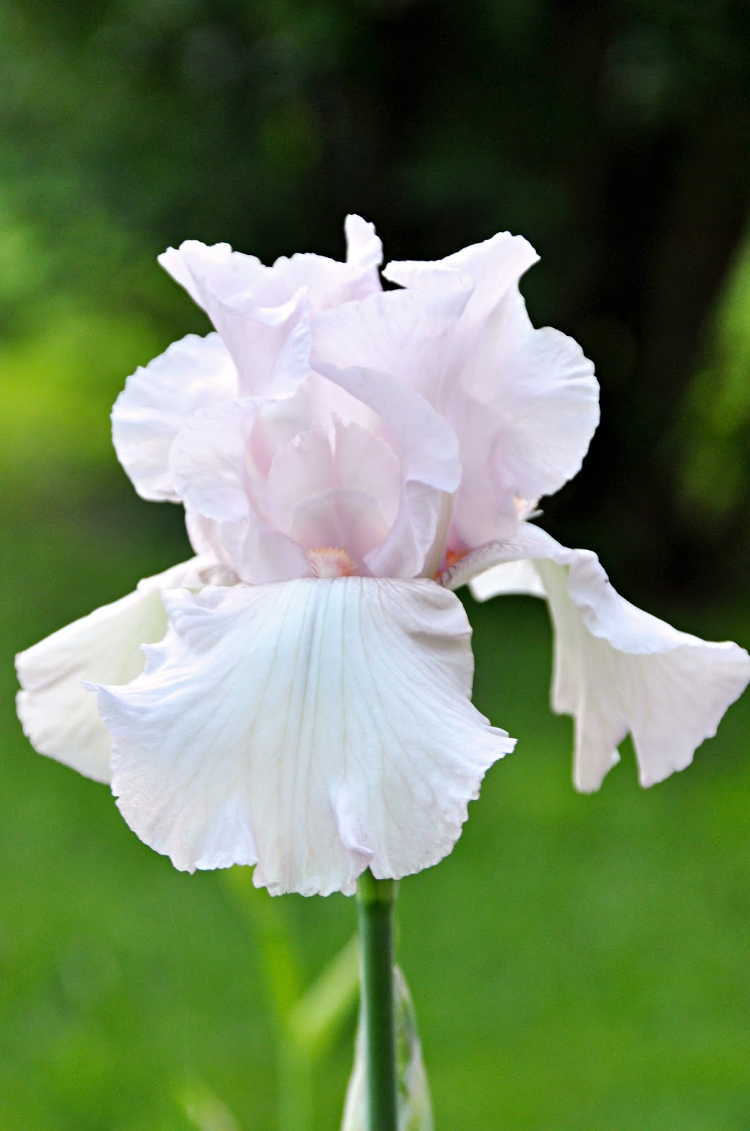 Nästan hudfärgad (även om puderrosa kanske låter lite trevligare) när den slår ut, bleknar snabbt till vitt. Några blommor förblir helt vita, några får små ljusrosa stänk och ytterligare några blommor får röda stänk. Omväxling förnöjer :) God och stark doft. Tyvärr långa och veka stjälkar, så stöd behövs!